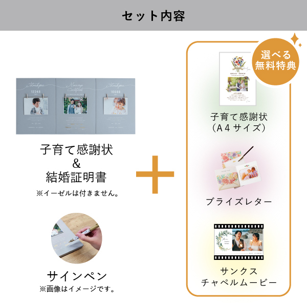 | 無料特典 | ブライズレター1セット(レターケース、専用レター5枚)、子育て感謝状(A4サイズ)(※フレームは付きません。)、サンクスチャペルムービーの中から1つお選びいただけます。 |
