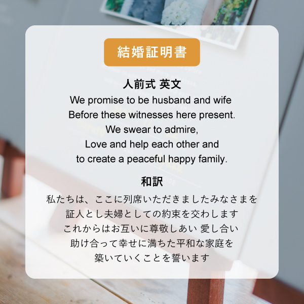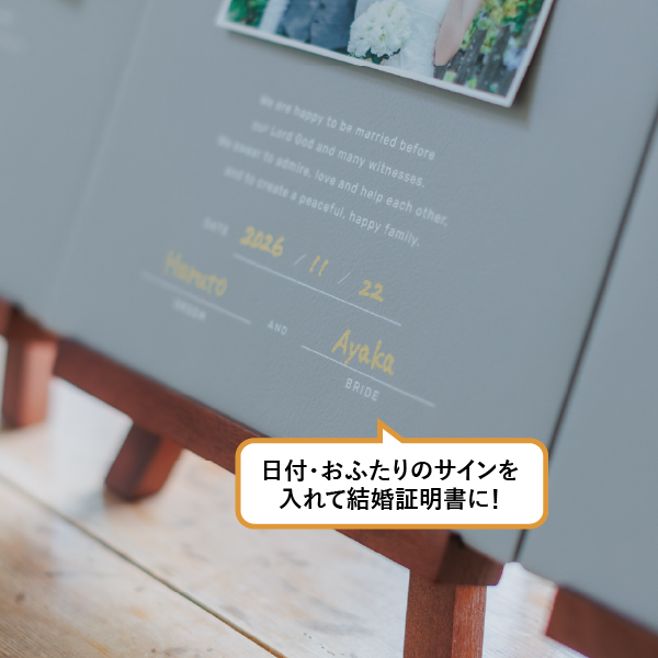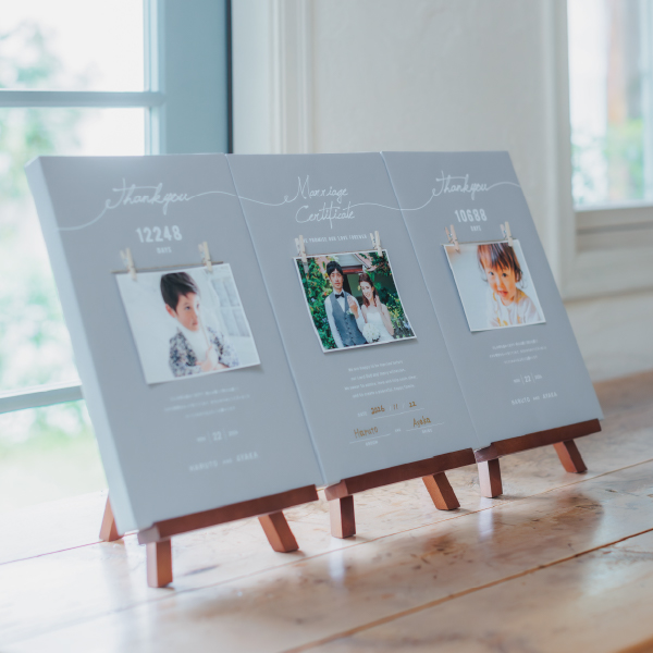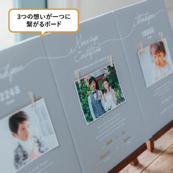 中央のボードには永遠の愛を誓った約束の証。両側には今まで育ててくれたご両親への感謝の気持ちを込めた子育て感謝状を飾ることができます。3つの想いがこもった繋がるボードで家族の絆をカタチにしませんか。