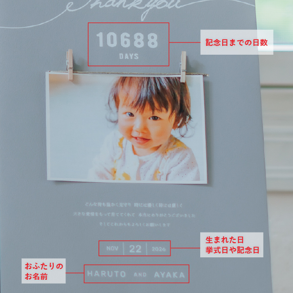 産まれてから結婚式までの思い出がいっぱい詰まった日数が刻みます。写真は付属の木製クリップで簡単に取り付けられることができ、挙式後は別の写真にすることも可能です。