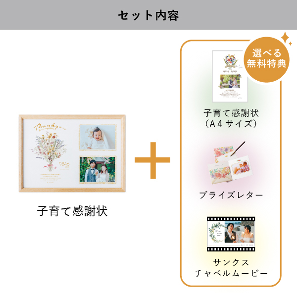 | 無料特典 | ブライズレター1セット(レターケース、専用レター5枚)、子育て感謝状(A4サイズ)(※フレームは付きません。)、サンクスチャペルムービーの中から1つお選びいただけます。 |