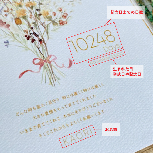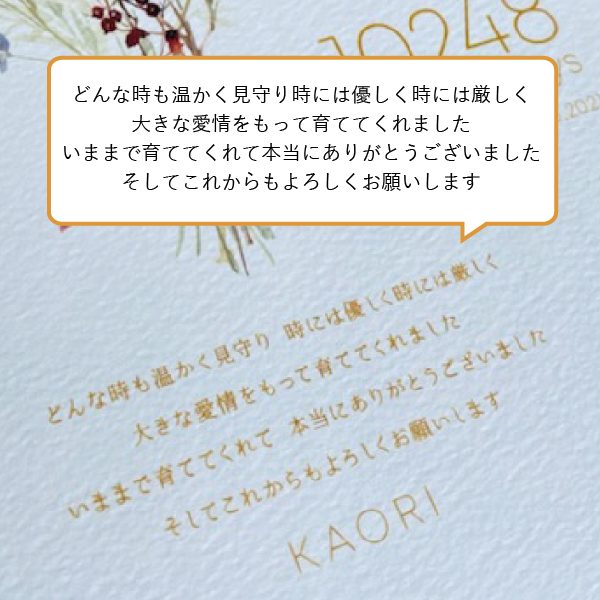 結婚式の両親プレゼントはもちろん、成人式などの節目へ贈るプレゼントや出産祝いのメッセージを入れるのにもおすすめです!
