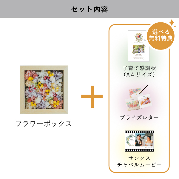 | 無料特典 | ブライズレター1セット(レターケース、専用レター5枚)、子育て感謝状(A4サイズ)(※フレームは付きません。)、サンクスチャペルムービーの中から1つお選びいただけます。 |