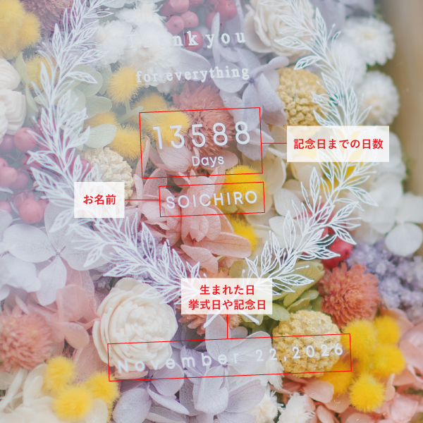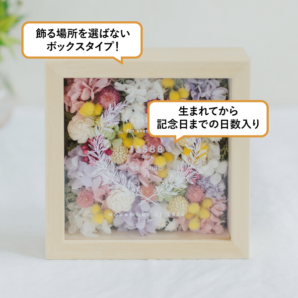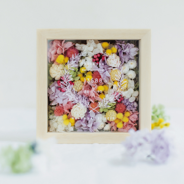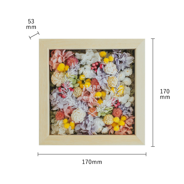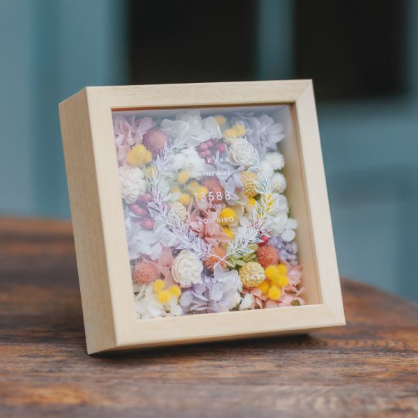 明るい木材を使用したナチュラルで、温かみのあるデザインは心も温かな気持ちにしてくれます。永い間色あせることのないフラワーギフトは結婚式での両親贈呈品はもちろん、記念日や父の日、母の日の贈り物としてもおすすめです。