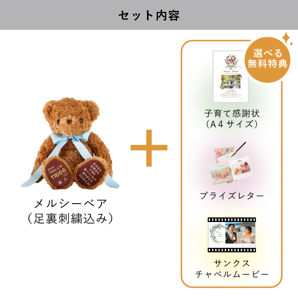 | 無料特典 | ブライズレター1セット(レターケース、専用レター5枚)、子育て感謝状(A4サイズ)(※フレームは付きません。)、サンクスチャペルムービーの中から1つお選びいただけます。 |
