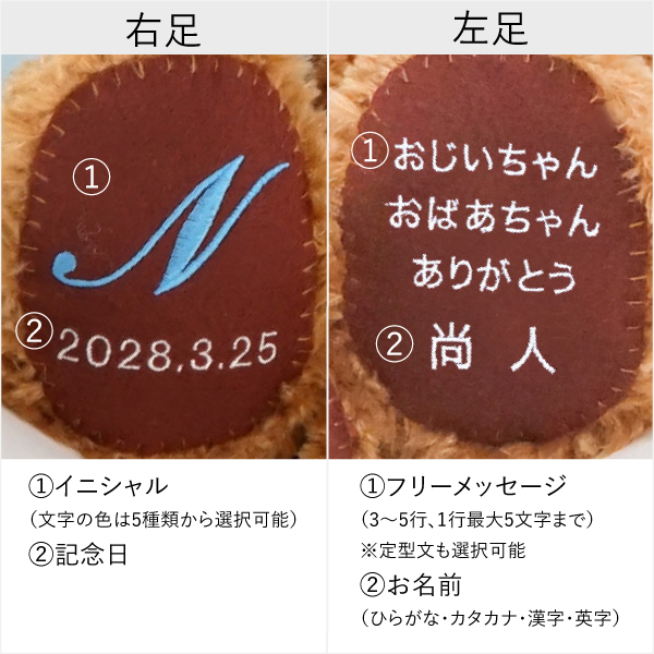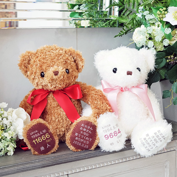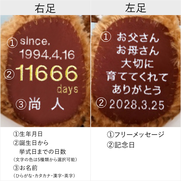 名前と生まれた日を足に記入して結婚式の両親へのプレゼントとして送ります。 新郎は茶色新婦は白と色違いにすることで可愛さもばいぞうです!