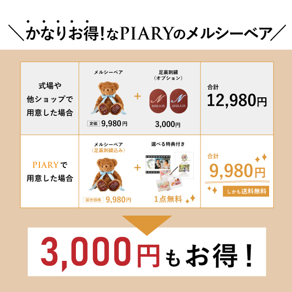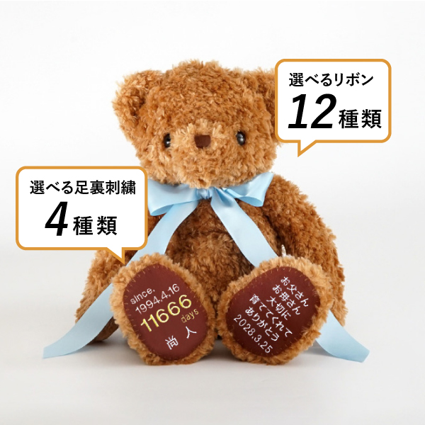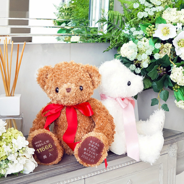 シャルル・フローラ披露宴での両親ギフトとして、茶色いベアとセットで購入しました。綺麗に包装されて届き、足に入ったメッセージも綺麗に刺繍されていました。式場から提案されたギフトはどれも高額すぎて困っていたのですが、こちらはリーズナブルなのにとっても可愛く、本当に満足しています。式はこれからですが、きっと喜んでもらえるんじゃないかな。今から楽しみです!