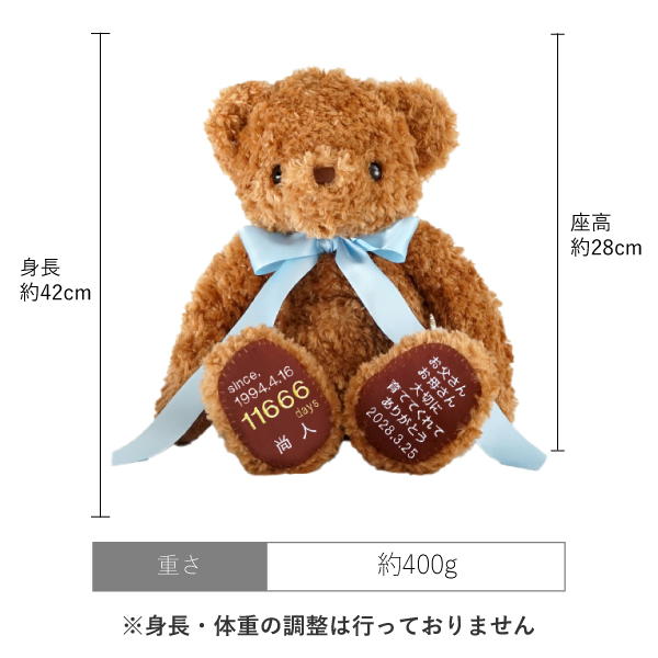 | サイズ | 座った状態:高さ約28cm、 立った状態:高さ約42cm、 胴回り約44cm、重さ約400g、 |