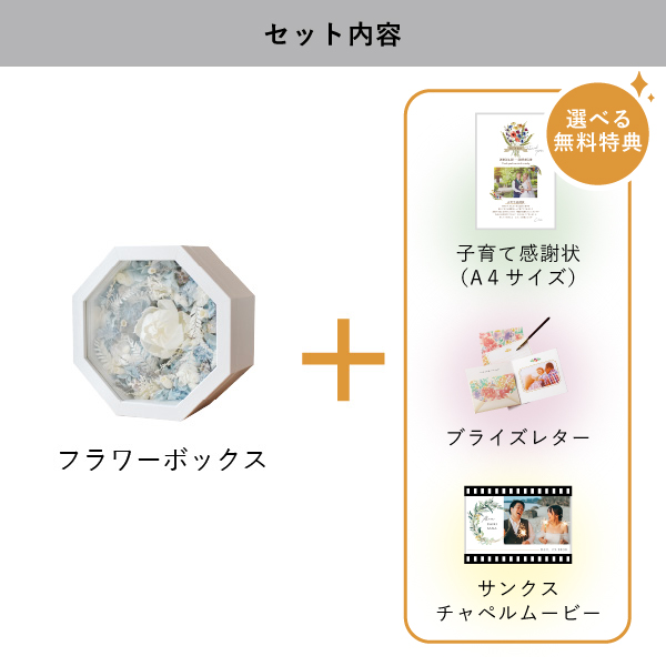 | 無料特典 | ブライズレター1セット(レターケース、専用レター5枚)、子育て感謝状(A4サイズ)(※フレームは付きません。)、サンクスチャペルムービーの中から1つお選びいただけます。 |