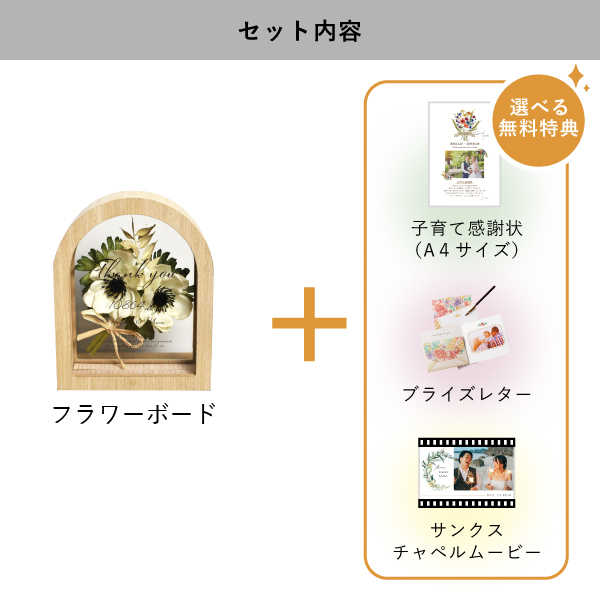 | 無料特典 | ブライズレター1セット(レターケース、専用レター5枚)、子育て感謝状(A4サイズ)(※フレームは付きません。)、サンクスチャペルムービーの中から1つお選びいただけます。 |