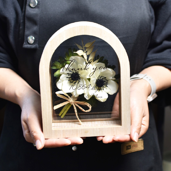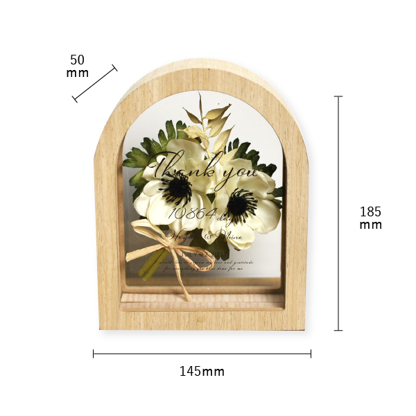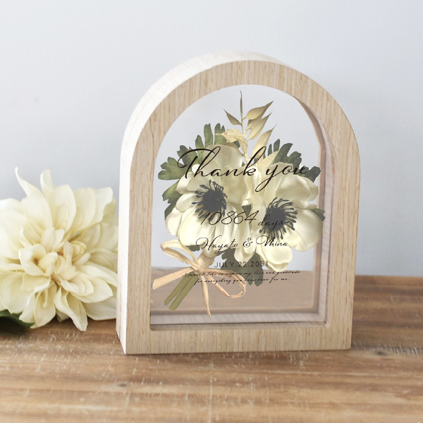 結婚式の両親への贈り物にふさわしい「子育て感謝状」。アーティフィシャルフラワーで作られた可愛いアネモネのブーケが透明感のあるフレームに納まっている感謝状です。文字プリントを業務用UVプリンターで精密にフレームの外側に印刷。透明感が際立ち、上品で高級感ある仕上がりです。普段は伝えにくい感謝の気持ちを、この特別な記念品に込めて贈りませんか?飾りやすいデザインで、ご両親の心に長く残る贈り物になります。こちらはSサイズです。文章も入れられる大きめサイズもご用意しています。