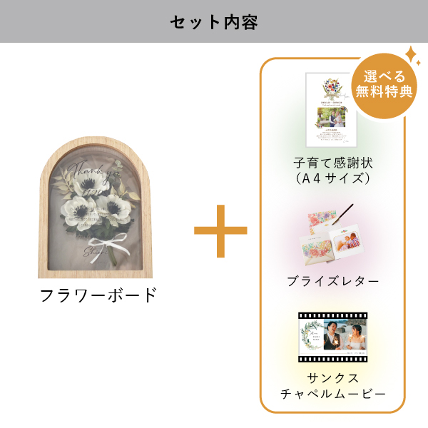 | 無料特典 | ブライズレター1セット(レターケース、専用レター5枚)、子育て感謝状(A4サイズ)(※フレームは付きません。)、サンクスチャペルムービーの中から1つお選びいただけます。 |