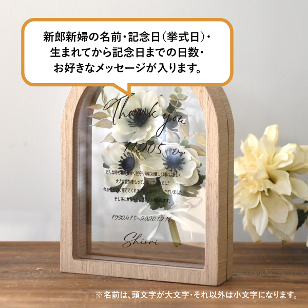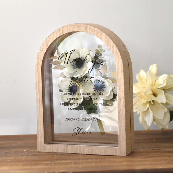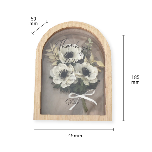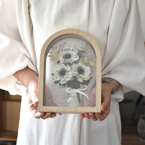 結婚式の贈り物に最適な「子育て感謝状」。アーティフィシャルフラワーで作られた可愛いアネモネのブーケを透明感あるフレームに納めた一品です。普段伝えられない感謝の言葉を精密な業務用UVプリンターでフレーム外側にプリントし、美しく仕上げました。透明感のあるデザインは、結婚式の特別な贈呈品としてふさわしく、受け取った両親も玄関やリビングに飾って長く楽しむことができます。大切な瞬間を彩る記念品としてぜひお選びください。こちらはLサイズです。小さめサイズもご用意しています。