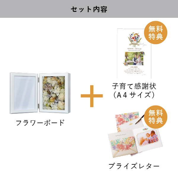 | 無料特典 | ブライズレター1セット(レターケース、専用レター5枚)、子育て感謝状(A4サイズ)(※フレームは付きません。)、サンクスチャペルムービーの中から1つお選びいただけます。 |