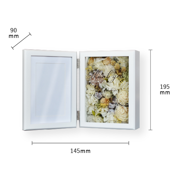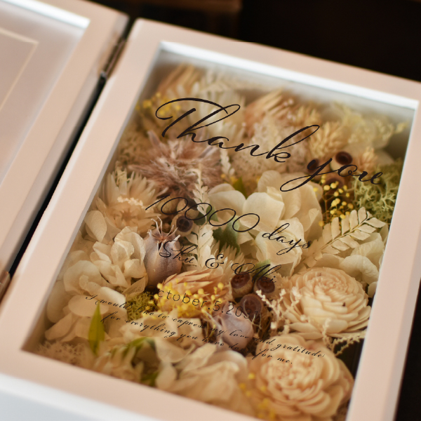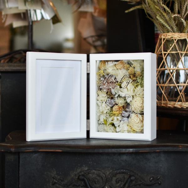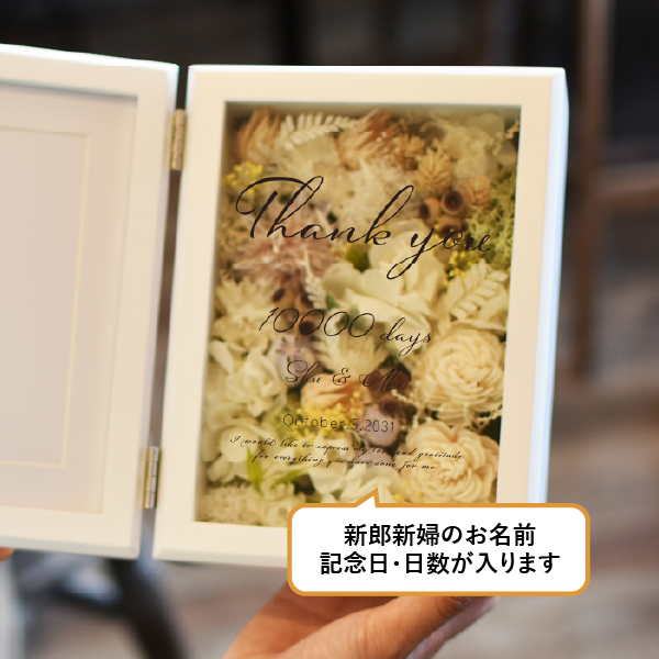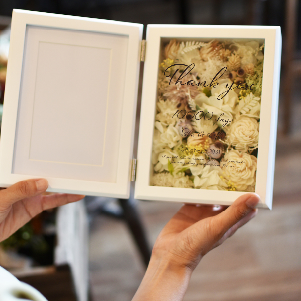 結婚式の両親へのプレゼントに最適な「子育て感謝状」。高品質なプリザーブドフラワーとドライフラワーを使用したフォトフレーム型の贈呈品です。高級感と重量感があるフレームに写真を添えることで、普段は伝えにくい感謝の気持ちを形にできます。披露宴のクライマックスを彩る贈り物としてぴったりです。アクリル板に収められた花は、ほこりを防ぎ直射日光を避けることで美しさを長期間保つことができ、お手入れも簡単です。