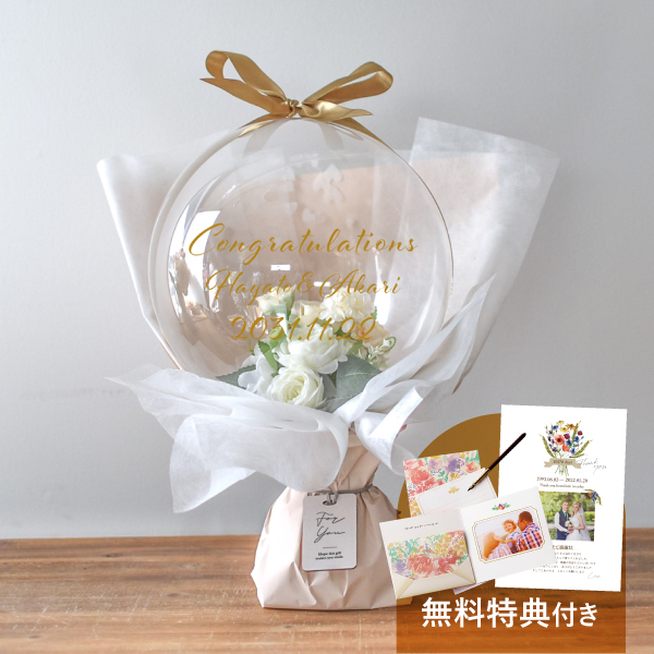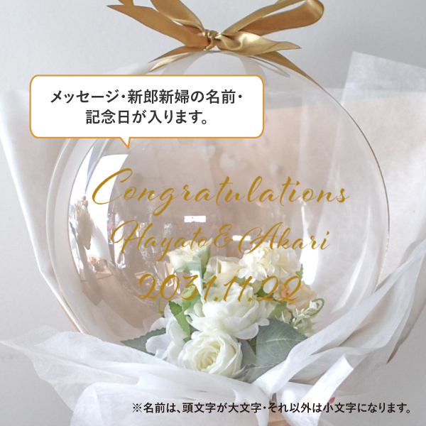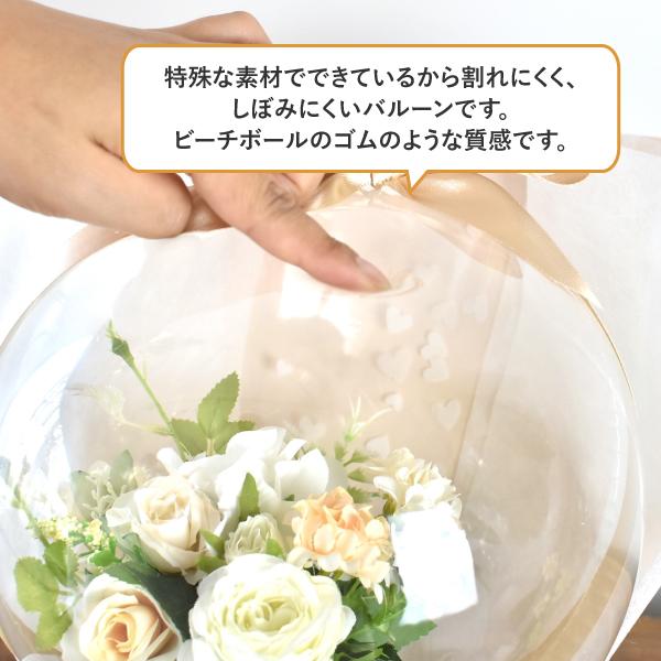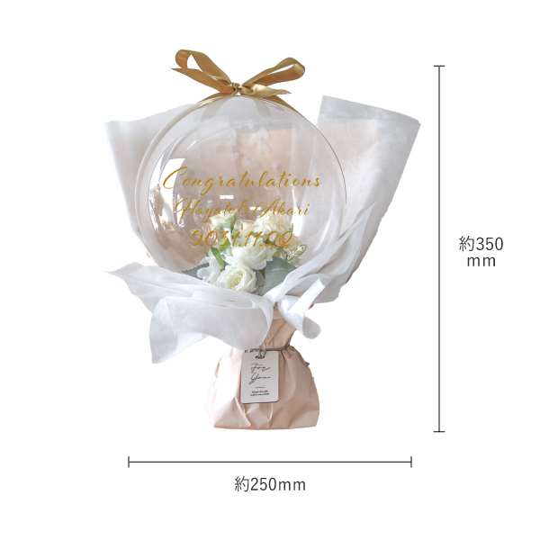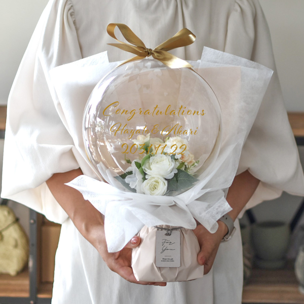 クリアバルーンの中にアートフラワーをアレンジした、上品で華やかなバルーンブーケ。割れにくく丈夫な素材で安心。メッセージ付きのため、世界にひとつのギフトになります。届いてすぐ飾れる自立型です。