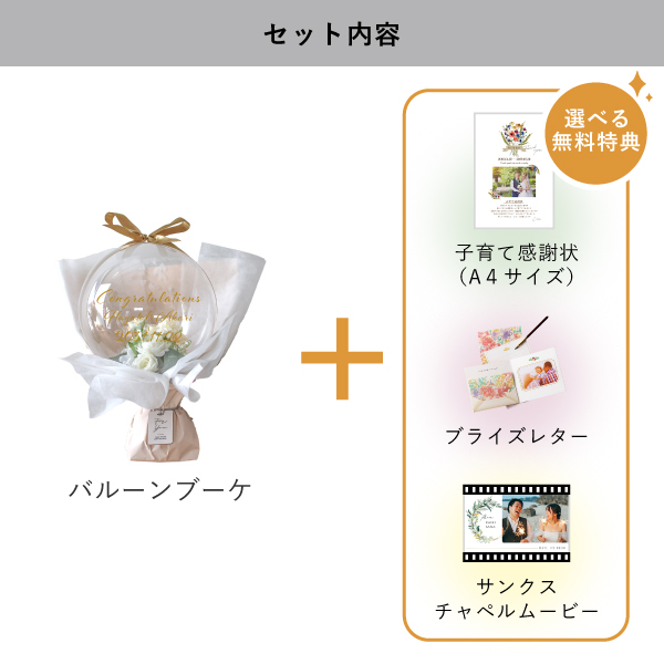 | 無料特典 | ブライズレター1セット(レターケース、専用レター5枚)、子育て感謝状(A4サイズ)(※フレームは付きません。)、サンクスチャペルムービーの中から1つお選びいただけます。 |