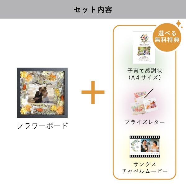 | 無料特典 | ブライズレター1セット(レターケース、専用レター5枚)、子育て感謝状(A4サイズ)(※フレームは付きません。)、サンクスチャペルムービーの中から1つお選びいただけます。 |