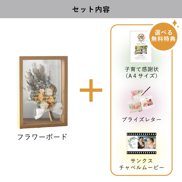 | 無料特典 | ブライズレター1セット(レターケース、専用レター5枚)、子育て感謝状(A4サイズ)(※フレームは付きません。)、サンクスチャペルムービーの中から1つお選びいただけます。 |