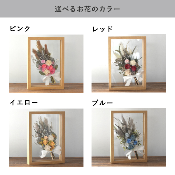 | 内容物 | 本体×1個 フラワーカラー:ピンク系、レッド系、イエロー系、ブルー系よりお選びいただけます。 メッセージ:4行×各20文字 自由にお好きなお言葉を入れられます。(ひらがな、カタカナ、漢字、アルファベットに限ります) 文字色:ホワイトとブラックよりお選びいただけます。 |