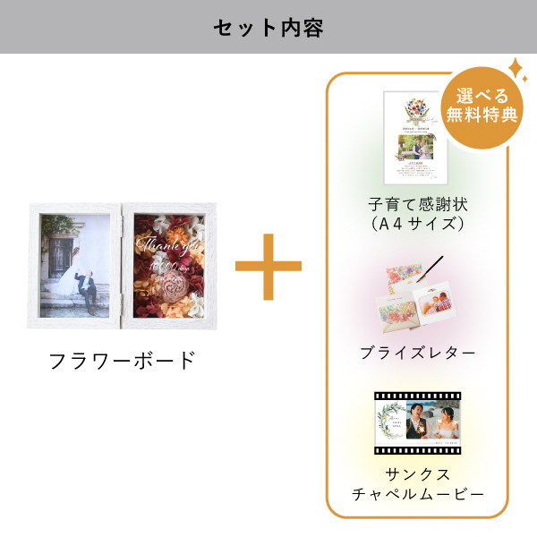 | 無料特典 | ブライズレター1セット(レターケース、専用レター5枚)、子育て感謝状(A4サイズ)(※フレームは付きません。)、サンクスチャペルムービーの中から1つお選びいただけます。 |