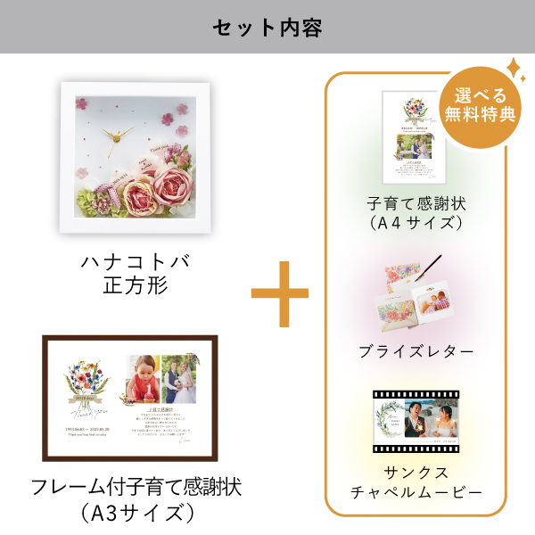 | 無料特典 | ブライズレター1セット(レターケース、専用レター5枚)、子育て感謝状(A4サイズ)(※フレームは付きません。)、サンクスチャペルムービーの中から1つお選びいただけます。 |