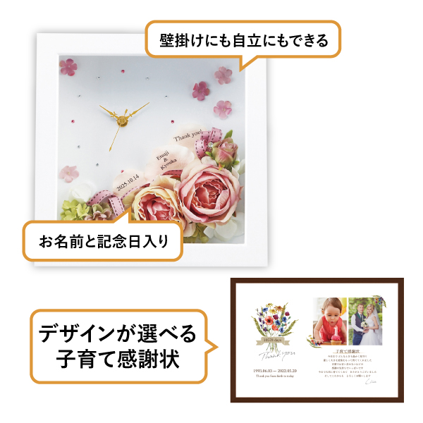 子育て感謝状を表彰状のように渡し、さらにアートフラワーを使った時計を渡すことで両親がもっと感動する演出に。