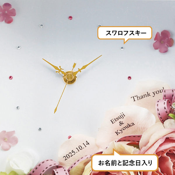 スワロフスキーを使った文字盤と、花びらに名前が入るところがおしゃれ!と喜ばれる贈り物です。