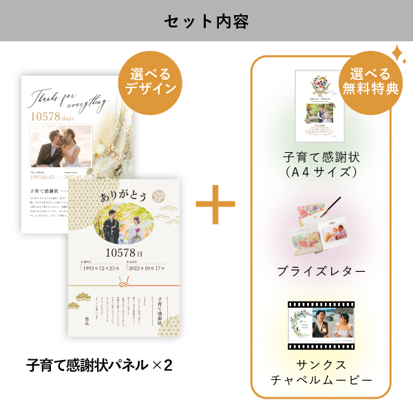 | 無料特典 | ブライズレター1セット(レターケース、専用レター5枚)、子育て感謝状(A4サイズ)(※フレームは付きません。)、サンクスチャペルムービーの中から1つお選びいただけます。 |