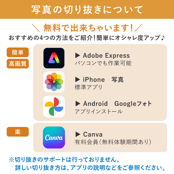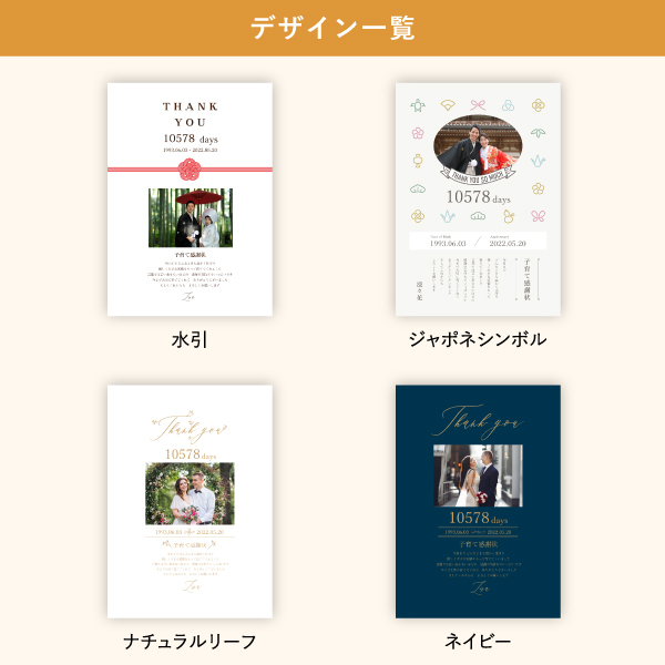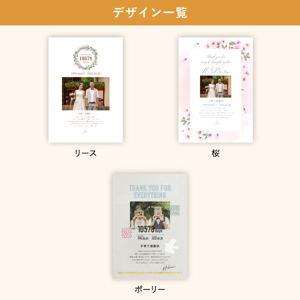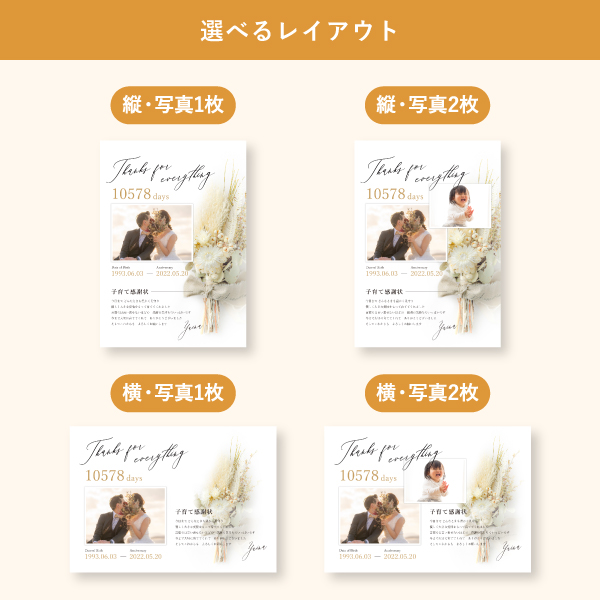 縦・横タイプや、写真1枚・2枚バージョンもご用意。