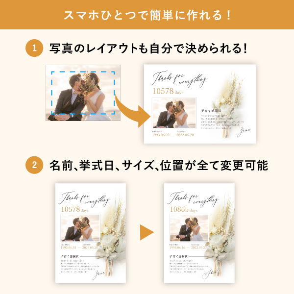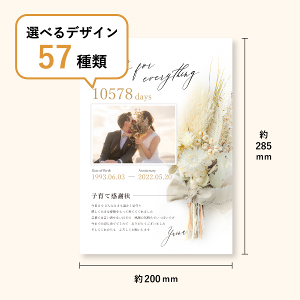結婚と同時に「子育て」を「卒業する」両親への感謝をつづる子育て感謝状。生まれた日から今日までの日付を記し、今までの感謝をこめて贈ります。(※フレームは付きません。)