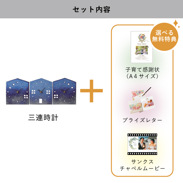 | 無料特典 | ブライズレター1セット(レターケース、専用レター5枚)、子育て感謝状(A4サイズ)(※フレームは付きません。)、サンクスチャペルムービーの中から1つお選びいただけます。 |