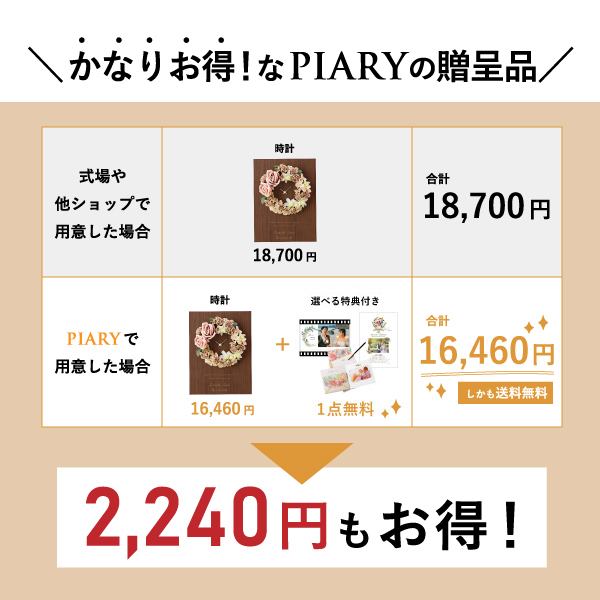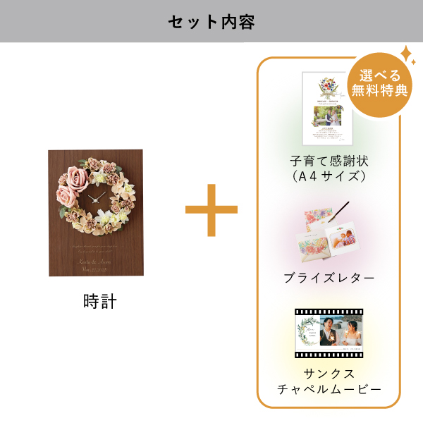 | 無料特典 | ブライズレター1セット(レターケース、専用レター5枚)、子育て感謝状(A4サイズ)(※フレームは付きません。)、サンクスチャペルムービーの中から1つお選びいただけます。 |