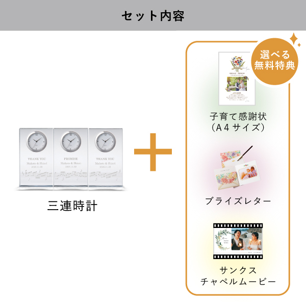 | 無料特典 | ブライズレター1セット(レターケース、専用レター5枚)、子育て感謝状(A4サイズ)(※フレームは付きません。)、サンクスチャペルムービーの中から1つお選びいただけます。 |