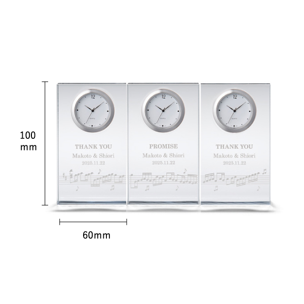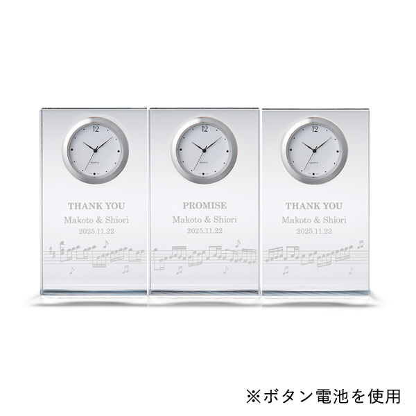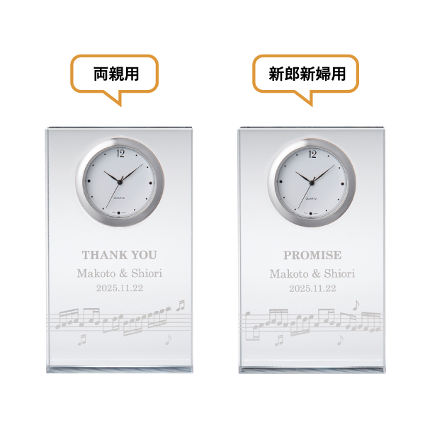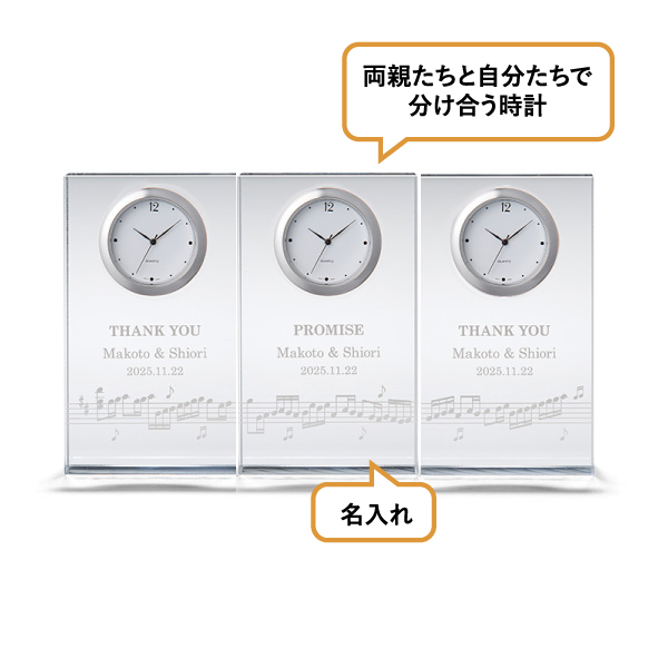 時計に描かれた音符は、実はカノンの楽譜になっています。3つのパートを追唱する、結婚式によく使用されている楽曲です。出会いが重なり、ひとつの家族になることを表しています。