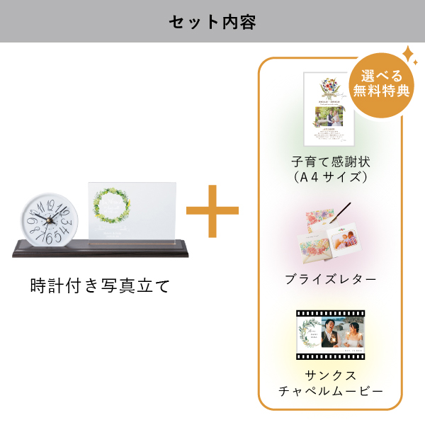 | 無料特典 | ブライズレター1セット(レターケース、専用レター5枚)、子育て感謝状(A4サイズ)(※フレームは付きません。)、サンクスチャペルムービーの中から1つお選びいただけます。 |
