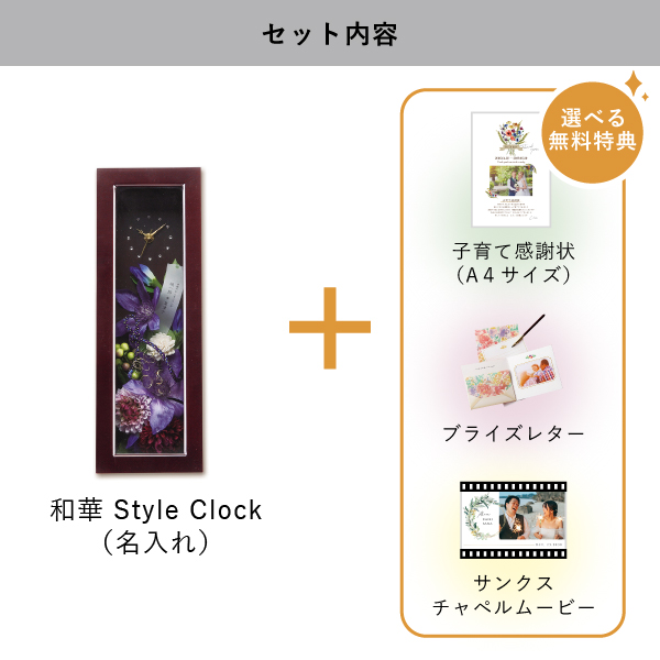 | 無料特典 | ブライズレター1セット(レターケース、専用レター5枚)、子育て感謝状(A4サイズ)(※フレームは付きません。)、サンクスチャペルムービーの中から1つお選びいただけます。 |