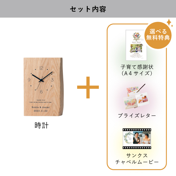 | 無料特典 | ブライズレター1セット(レターケース、専用レター5枚)、子育て感謝状(A4サイズ)(※フレームは付きません。)、サンクスチャペルムービーの中から1つお選びいただけます。 |
