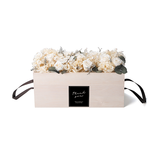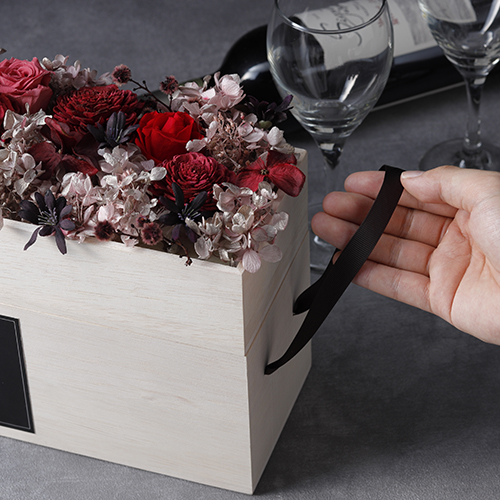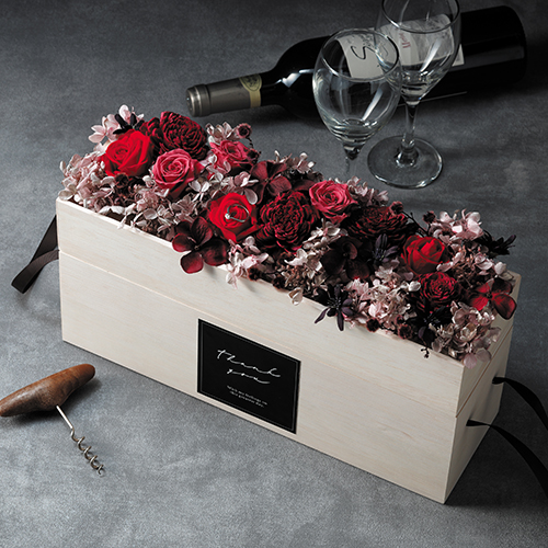枯れない花「プリザーブドフラワー」で飾られた、ワインのボトルを贈れるおしゃれな木箱。