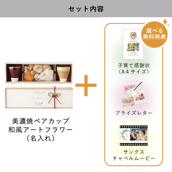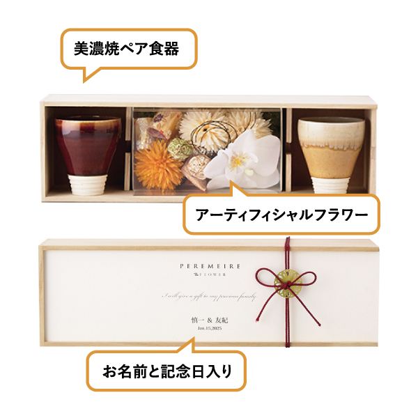 人気のペアカップと和風アートフラワーのセット。いつまでも飾っておけるアーティフィシャルフラワーは木箱から取り出して飾れるように美しくパッケージングされています。