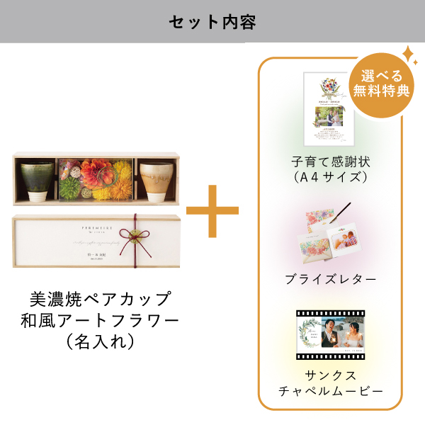 人気のペアカップと和風アートフラワーのセット。いつまでも飾っておけるアーティフィシャルフラワーは木箱から取り出して飾れるように美しくパッケージングされています。