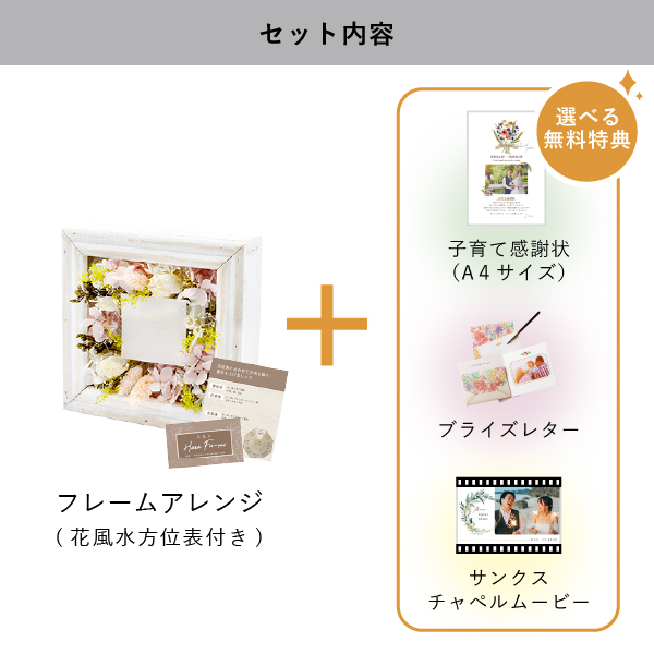 | 無料特典 | ブライズレター1セット(レターケース、専用レター5枚)、子育て感謝状(A4サイズ)(※フレームは付きません。)、サンクスチャペルムービーの中から1つお選びいただけます。 |