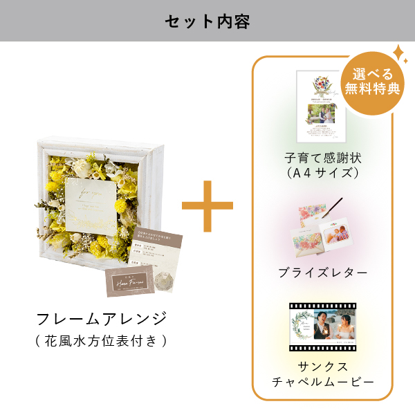 | 無料特典 | ブライズレター1セット(レターケース、専用レター5枚)、子育て感謝状(A4サイズ)(※フレームは付きません。)、サンクスチャペルムービーの中から1つお選びいただけます。 |