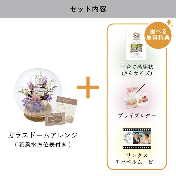 | 無料特典 | ブライズレター1セット(レターケース、専用レター5枚)、子育て感謝状(A4サイズ)(※フレームは付きません。)、サンクスチャペルムービーの中から1つお選びいただけます。 |
