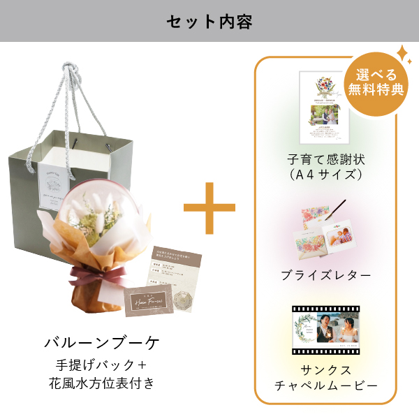 | 無料特典 | ブライズレター1セット(レターケース、専用レター5枚)、子育て感謝状(A4サイズ)(※フレームは付きません。)、サンクスチャペルムービーの中から1つお選びいただけます。 |
