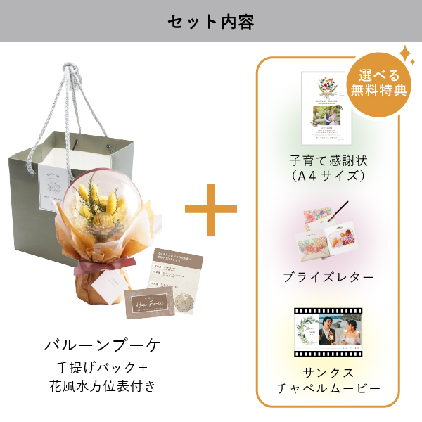 | 無料特典 | ブライズレター1セット(レターケース、専用レター5枚)、子育て感謝状(A4サイズ)(※フレームは付きません。)、サンクスチャペルムービーの中から1つお選びいただけます。 |