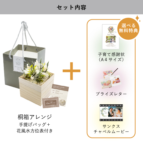 | 無料特典 | ブライズレター1セット(レターケース、専用レター5枚)、子育て感謝状(A4サイズ)(※フレームは付きません。)、サンクスチャペルムービーの中から1つお選びいただけます。 |