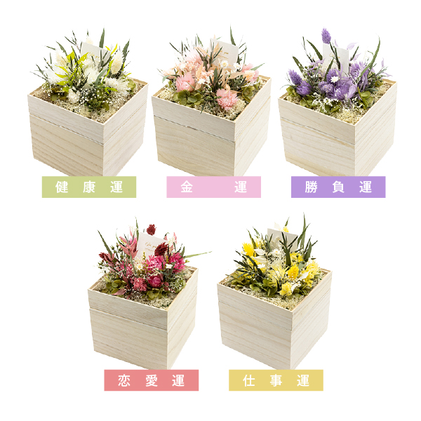 花風水には、恋愛運・金運・仕事運・勝負運・健康運の5つの運気があります。伝えたい想いでお花の色を選んでください。