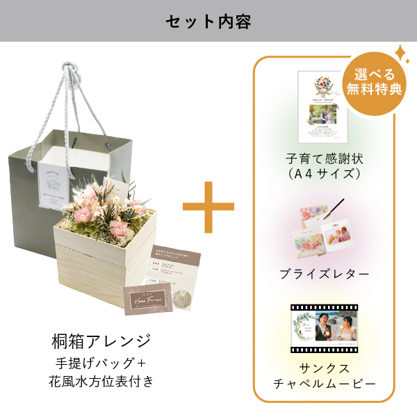 | 無料特典 | ブライズレター1セット(レターケース、専用レター5枚)、子育て感謝状(A4サイズ)(※フレームは付きません。)、サンクスチャペルムービーの中から1つお選びいただけます。 |