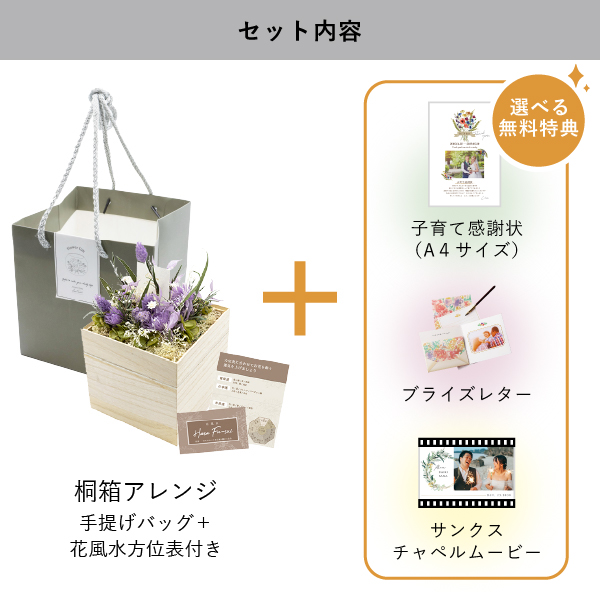 | 無料特典 | ブライズレター1セット(レターケース、専用レター5枚)、子育て感謝状(A4サイズ)(※フレームは付きません。)、サンクスチャペルムービーの中から1つお選びいただけます。 |