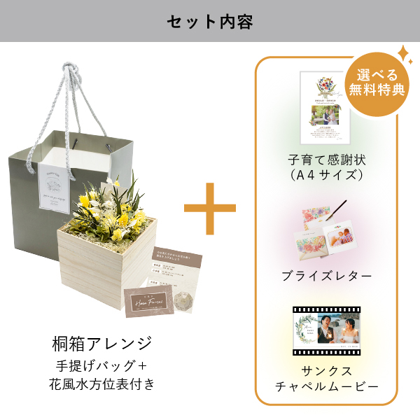 | 無料特典 | ブライズレター1セット(レターケース、専用レター5枚)、子育て感謝状(A4サイズ)(※フレームは付きません。)、サンクスチャペルムービーの中から1つお選びいただけます。 |